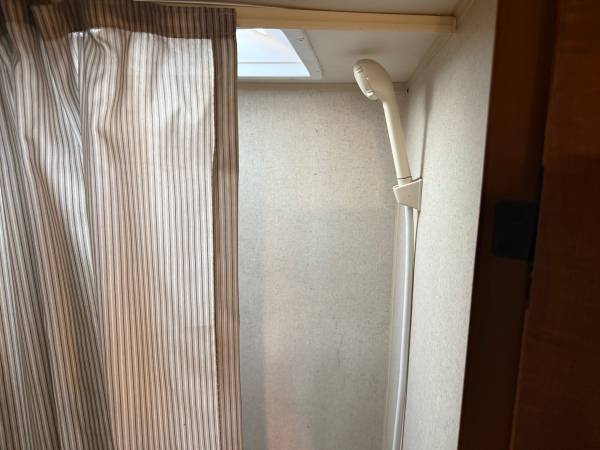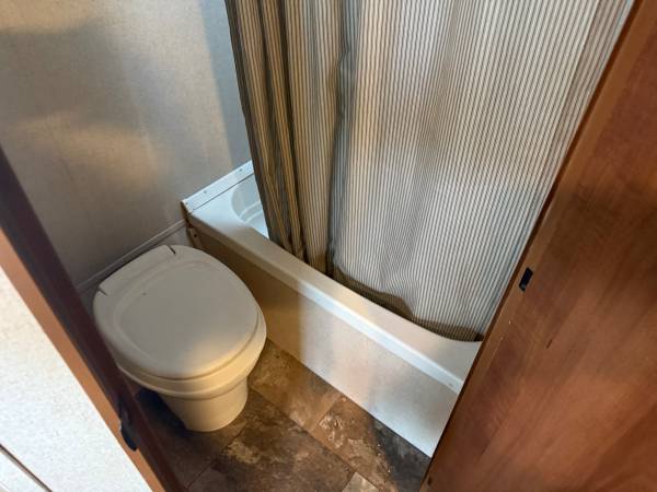 Bathroom: Toilet, shower/tub, skylight, and fan.