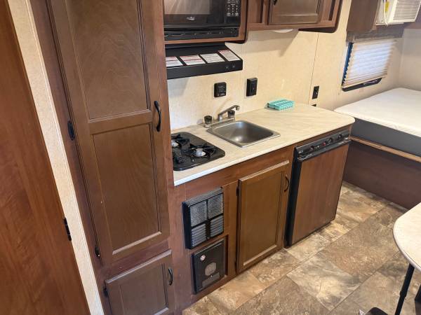 Kitchen: Two-burner range, microwave, sink, refrigerator, and a pantry.