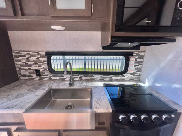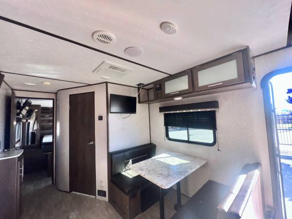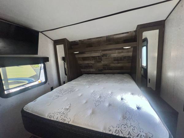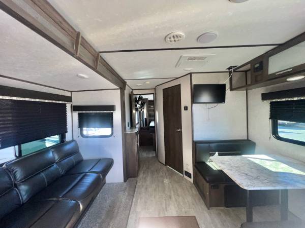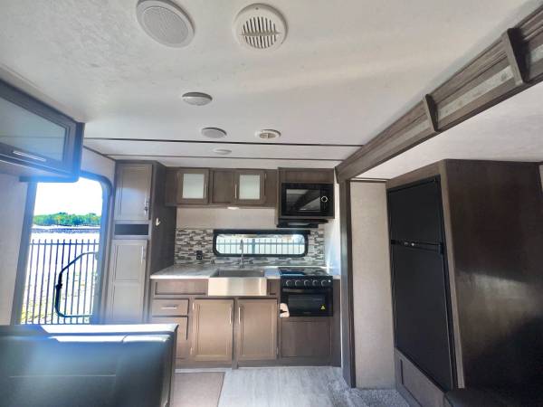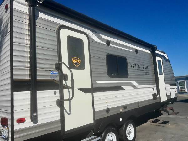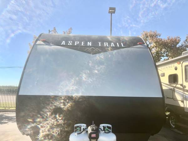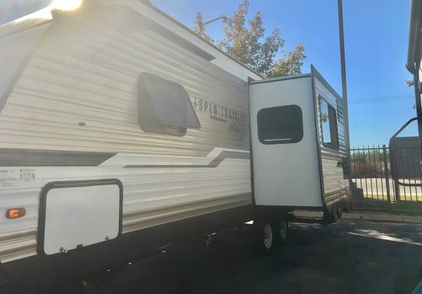 2021 trail aspirin travel trailer made by Dutchman 27 foot long fully self-contained double entry doors one slide out front queen walk around bed rear kitchen with stove refrigerator freezer microwave jack and Jill bathroom central heat and air electric awning electric jacks tons of storage super clean in and out everything works no leaks great for Camping for more information please contact me anytime at 209-402-3140