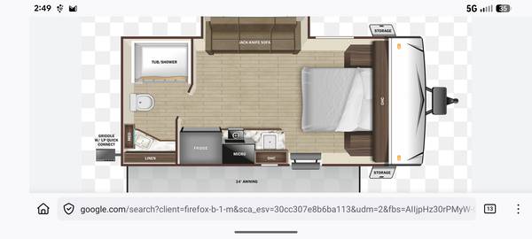Slide-out with sofa for extra interior space. Sofa turns into also pulls out into a 2nd full size bed.