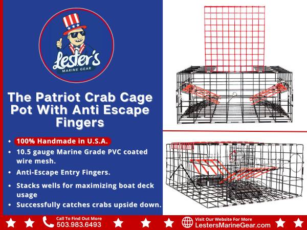 ◼️ Lester's most innovative crab pot! The Patriot Pot is designed to still allow crabs to enter the trap, even if the tide flips the trap upside down. A modular design allows for multiple Patriot Pots to stack and store easily in your boat. ◼️ 100% American Made. ◼️ 10.5 gauge Marine Grade PVC coated wire mesh. ◼️ Anti-Escape Entry Fingers. ◼️ Stacks wells for maximizing boat deck usage. ◼️ Successfully catches crabs upside down. ◼️ The price Does NOT include a bait box, buoys, or rope.