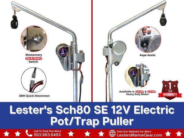 ➤ Lester's 3-piece RA 12V Electric Pot Puller package features a heavy-duty 1.5” Schedule 80 aluminum davit and a water-resistant 12V DC motor available in 2.0 HP or 2.5 HP. A Rope Assist device is installed to eliminate rope slippage.