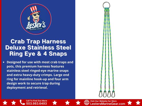 ◼️ Designed for use with most crab traps and pots, this premium harness features stainless steel ringed-eye marine snaps and extra heavy-duty crimps. Large end ring for mainline hook-up and four arm design work to secure trap during deployment and retrieval.