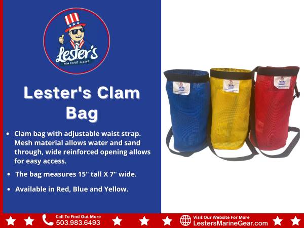 ◼️ Clam bag with adjustable waist strap. Mesh material allows water and sand through, wide reinforced opening allows for easy access. The bag measures 15" tall X 7" wide. Available in Red, Blue and Yellow.