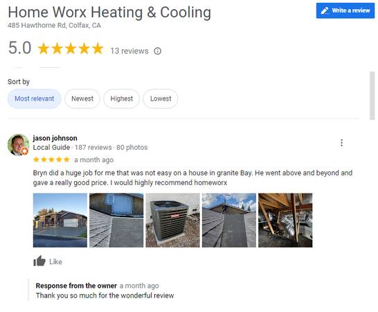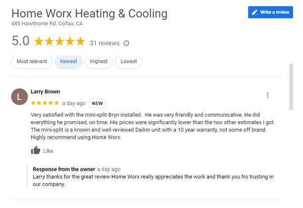 Home Worx Heating and Cooling has 5-star Google Reviews for installations and Service
