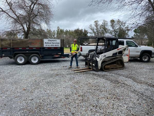 LICENSED, BONDED AND INSURED!!!!! SOD REMOVAL, BASEROCK DRIVEWAYS, HAULING, CONCRETE DEMOLITION, POOL DEMOLITION, POOL FILLING, LANDSCAPING, EARTHWORK, DIRT WORK, EXCAVATION, GRADING, ROTOTILLING, TRENCHING, UTILITY TRENCHES, LANDCLEARING, BRUSH REMOVAL, ROCK & STONE REMOVAL, STUMP REMOVAL, ROCK WALLS, RETAINING WALLS, AUGERING, POSTHOLE DIGGING, FOOTINGS, FOUNDATIONS, BUILDING PADS, RV PADS, SWALES, DRAINAGE, DEMOLITION, WHAT EVER YOU NEED AND MUCH MORE!!!!! I have a S185 Bobcat and T450 track Bobcat with a tooth bucket, flat bucket and auger (with 12", 18" and 24" bits with an extension) a trencher and rototiller and forks. I also have a dump trailer. My name is Clayton you can call on my cell at (916) 899-8693. Text me pictures of your projects too! I do quality work and have over 14 years of experience and I'm also very easy to work with. Please check out my website at www.claytonsaffordablebobcatservices.com