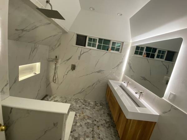 LVP, TILE, Backsplash, Bathroom, Laminate, Vinyl, Refinish, hardwood, cabinets, vanity, piers, foundation, dry rot, water damage, mold, waterproofing, exterior seal