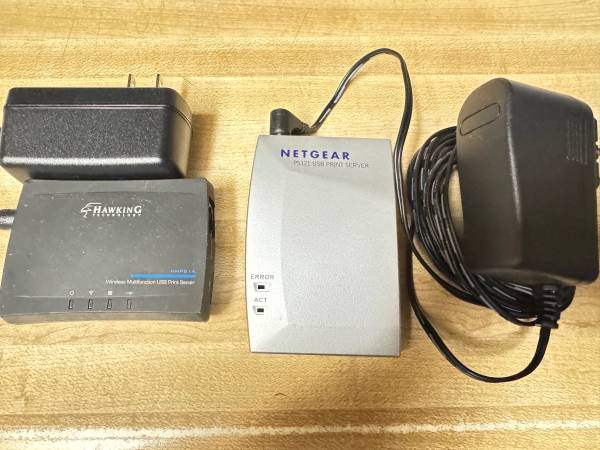 If your older printer was an excellent quality high end printer, but isn't wireless and you've been thinking about getting rid of it, only to purchase another expensive printer, then think no further than this simple device you can hook up both USB & Ethernet (network cable), making your printers wireless. I have two of these and their cheap! $20 o/bo ea. Call as I'm not doing email, leave a message and I'll know your serious;) Can deliver within reason and an extra $. show contact info