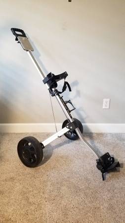 Cart has minor wear but in good shape overall. Has a cup holder, scorecard holder, 2 golf ball slots (rear side of handle) and four golf tee holders. Easy to collapse and light weight. Rolls great!