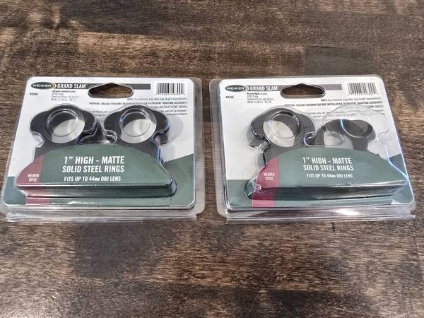 New Weaver Grand Slam 1 inch High Matte Solid Steel Scope Rings - 49300 for $30/both. Package is a little distressed. *The price is firm, please no offers. *I'm located near the Post Office 161W...