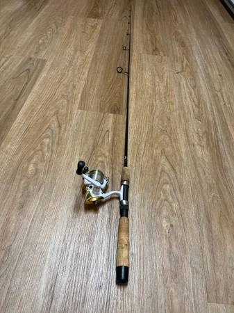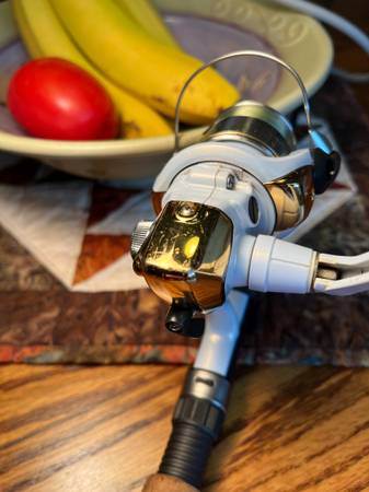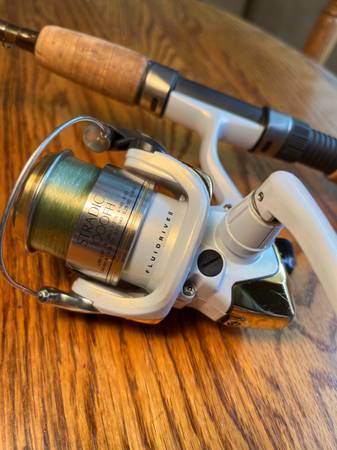 This is a trout rod/reel with a Shimano Stradic 1000 FH pearl white reel mounted to a Shimano Clarus 5 ft 6 in one piece rod, 2-8 line wt, 1/16-1/4oz lure wt, The reel is next to very good+ condition, Has super stopper II and fluid drive II, has a few tiny scratches on bottom of gold plate in back of reel, the white pearl paint is perfect, the rod is excellent condition with no problems, no wear. 135.00 CASH ONLY, NO SHIPPING, Local door pickup only in downtown Lincoln Calif.
