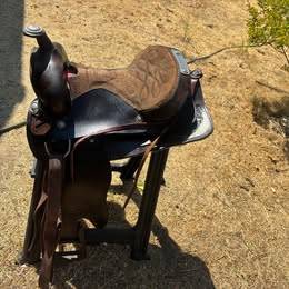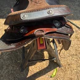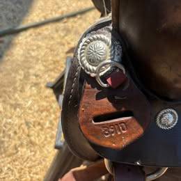 Very solid saddle in good condition. Brown/Black in color. It had German silver that needs cleaning. It is set up with a rear crooper leather with a snap to keep the saddle from moving forward on steep downhill trails. It was used with a breast collar for steep uphill riding. [Breast collar and crooper not included] It is also set up for a back cinch. Also, it is set up with leather tie-downs for saddle bags.