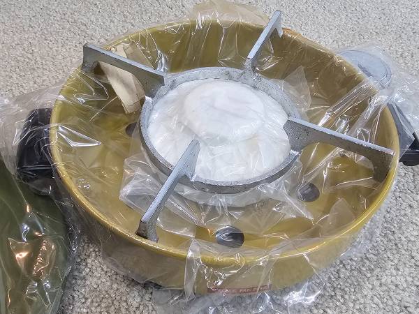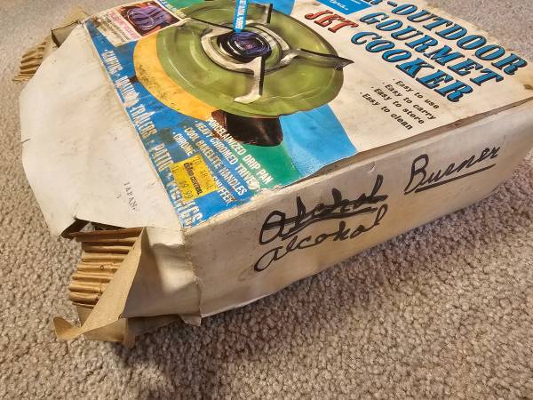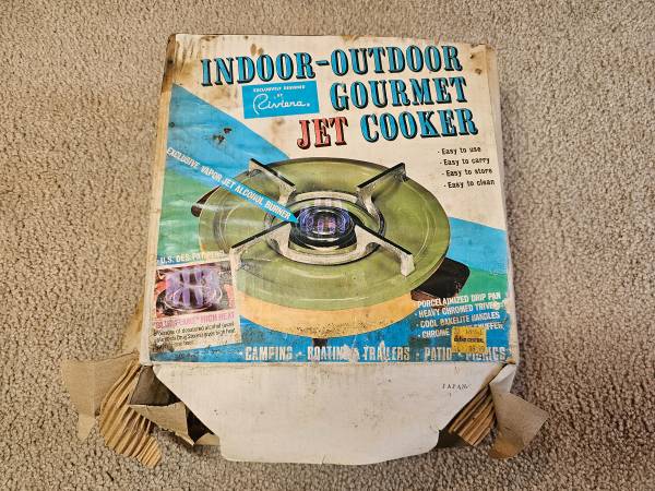 Vintage Riviera Indoor Outdoor Gourmet Jet Cooker Alcohol Burner Stove - circa 1971. Has not been used (although the box appears to have gone to war)!! The Riviera vintage 1971 Indoor-Outdoor Gourmet Jet Cooker is a unique and versatile stove. One burner powered by denatured alcohol, this jet cooker is perfect for both indoor and outdoor cooking. The green/yellow color adds a pop of retro style, while the Japanese craftsmanship ensures durability and reliability. Whether you're a collector of vintage stoves or looking for a fun piece, the Riviera Jet Cooker is sure to impress with its timeless design and innovative features.