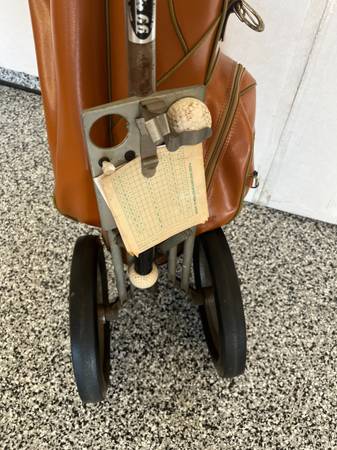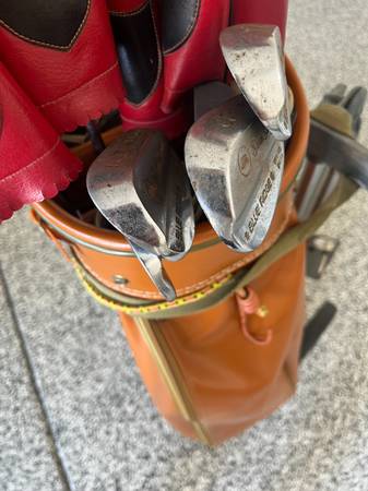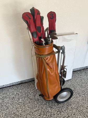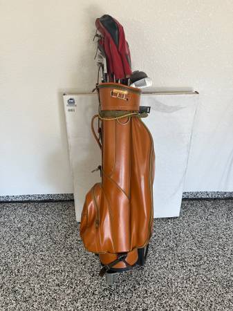 Vintage Sam Snead "Blue Ridge" golf club set with wheeled bag. Clubs are used but appear to be good shape. Handle grips also appear to be in good condition.