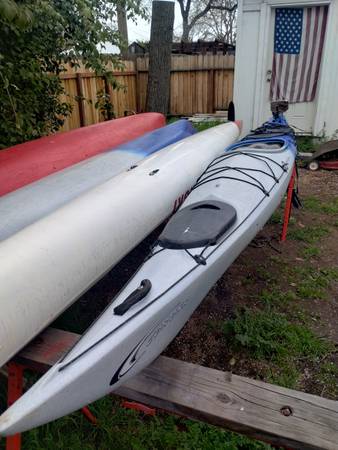 Pic,#11 is a 17’ Lightweight Mohogany wood and fiberglass touring kayak with a padded seat/back rest for $750.00-10%=$675.00.