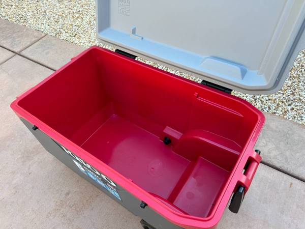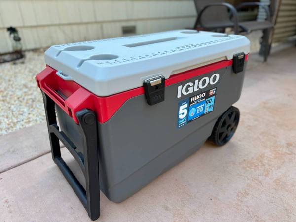 Igloo 90 Qt Maxcold Rolling Cooler Brand new Large all-terrain wheels Flip-up tow handle Hybrid latches Holds up to 137 cans Dims: 32"L x 18"W x 20" H Weight: 22.5 lbs Pick up