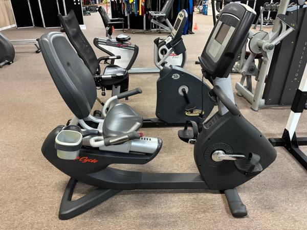 This is a LifeCycle 95R Inspire Recumbent Exercise Bike. It has the touch-screen console. It has several programs and heart rate. There are 25 levels of resistance. Resistance can be changed on the console or at the end of the handlebar. It has an easy entry, walk thru design. There are wheels for easy transport. It has a brand new battery.