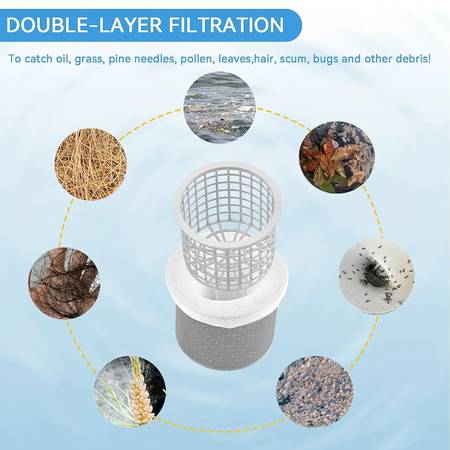 [Innovation 2: There are 2 plastic filter meshes inside, which can filter 100% of the impurities in the swimming pool]: This is another major innovation of the above ground pool skimmer. Installing Skimmer Socks between 2 plastic filter meshes can filter 100% of the impurities in the swimming pool. Adding a filter mesh inside the Skimmer Socks makes the Skimmer Socks spread more evenly, so you don’t have to worry about the suction of your pump becoming weaker.