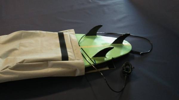 This is a very nice tri-fin surfboard that comes with a cover and leg cord. This is a great complete package, especially if you like to travel around. The cover is brand new and waterproof. The surfboard is 6 feet long.