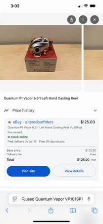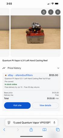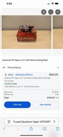 Like new preowned (Quantum-Vapor) bait caster fishing reel. Left-handed. Retails for $125 for a new reel.