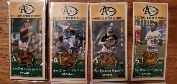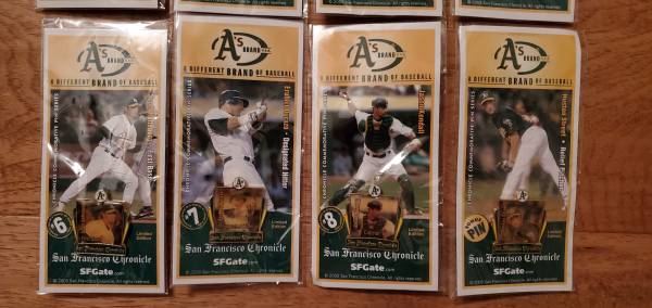 I have a "new" set of 2005 San Francisco Chronicle commemorative pin series. Players include..... Bobby Crosby Eric Chavez Mark Kotsay Octavia Dotel Scott Hatteburg Erubiel Durazo Jason Kendall...