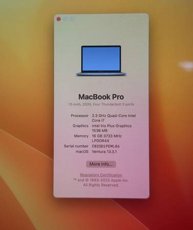 MacBook Pro 2020 13 inch 2.3 i7 16GB 1TB Iris Plus Graphics 1.5GB Battery Capacity: 81 Battery Cycles: 131 BTO/CTO Text preferred 916 SevenThree5 5966. Visit our website applefixpros dot com for...