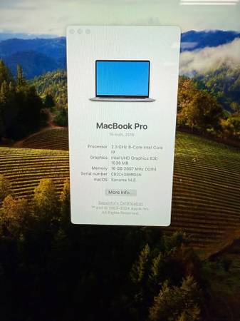 Apple - 2019 MacBook Pro Year: 2019. Model: MacBook Pro. Size: 16 inch. Processor: 2.3 GHz 8-core i9. Memory: 16GB. Storage: 1TB. GPU: Radeon Pro 5500M 4GB. Color: Space Gray. MVVK2LL/A. Text...
