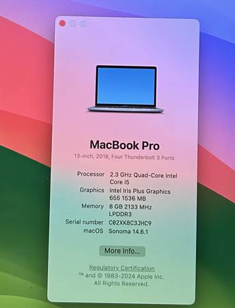 Model: MacBook Pro Year: 2018 Size: 13 inch CPU (Processor): 2.3GHz 4-core i5 Graphics (GPU): Iris Pluse 655 1.5 GB Memory: 8GB Storage: 512 GB SSD USED( CHECK PICTURES ) Include: Charge and USB-C...