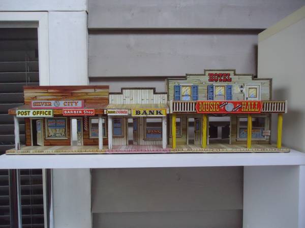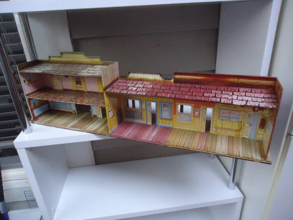 Vintage Lithograph printed Tin sheetmetal Silver City western town by MARX Toys iand BAR-M-RANCH n wonderful well preserved condition , $200 for both.