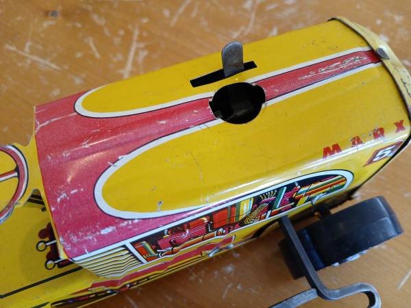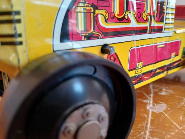 For sale is a classic vintage Marx "No. 5" wind-up tin toy tractor. This charming piece of Americana is in good, functional condition, a testament to its durable craftsmanship. The vibrant, original lithographed details depict a detailed engine and internal components, a hallmark of Marx toys. The tractor winds up easily and moves forward smoothly, providing a full minute and a half of classic wind-up action. Its robust design includes a tail hitch, perfect for pulling other vintage tin toys. While it shows some light scratches and a small, repairable dent on the rear right panel, these are consistent with its age and history. This piece is perfect for a collector or anyone who appreciates the nostalgia of mid-century toys.