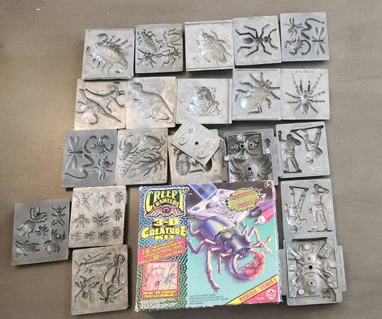 I'm selling a Mattel Creepy Crawlers Big Kit that includes an oven that is like new, 20 aluminum molds (lizards, bugs, spiders, beetles, dinosaurs, soldiers and some injection molds), and 9 bottles of goop in various colors (all about half-full) with instructions.