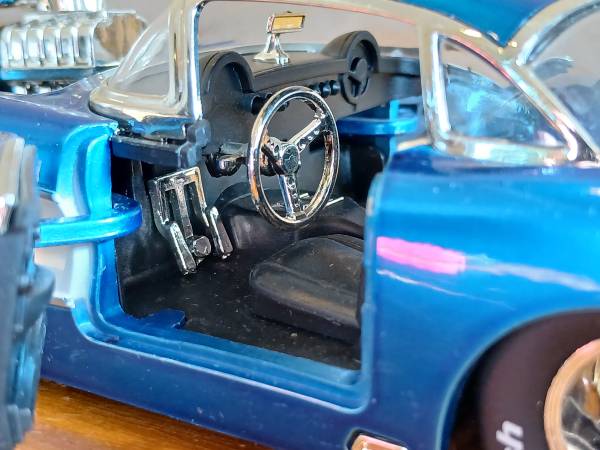 Up for grabs is a cool, modified 1/24 scale 1957 Chevy Corvette die-cast model from the Jada Toys Big Time Muscle series. This classic C1 'Vette is decked out like a gasser or hot rod with a gorgeous metallic blue paint job, white cove inserts, and an aggressive stance. It features a massive, exposed chrome blower engine for that true drag strip look!