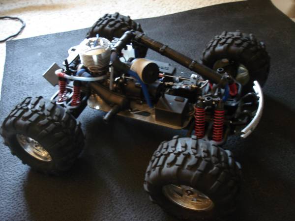 For sale is a Traxxas Tmaxx 2.5 custom build nitro powered monster truck. Options include an ANC giant aluminum cooling head,roll bar,spektrum high torque steering servo,traxxas big boar aluminum shocks , Hpi Savage tires and wheels and a custom made diamond plate aluminum chassis. A Flysky radio and receiver and electric starter are also included. Contact is initially through email,cash only,meet at a neutral location.