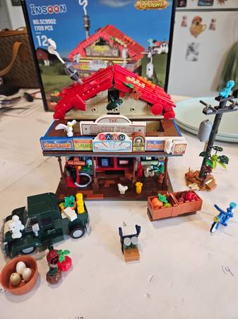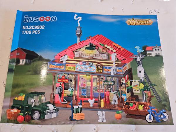 Off brand building blocks ( lego type) 1,709 pieces. Was a really fun build. So many cute treasures inside and out. Rebagged. Comes with box, instruction book. All pieces are there. Lego sized bricks. I don't have room to keep them. I enjoy building & then they have to go.