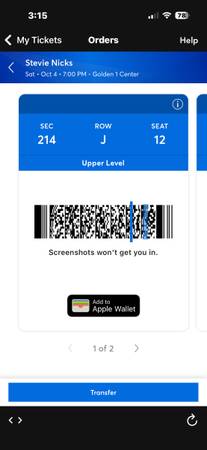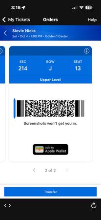 2 tickets to see Stevie Nicks at Golden 1 Center, Saturday October 4, 2025. Unfortunately I can’t use them, valued at $400. I accept Venmo and will then transfer the tickets via Ticketmaster