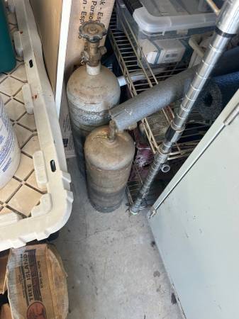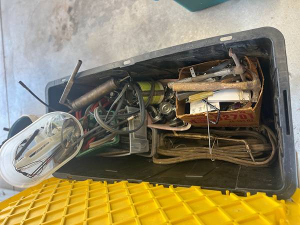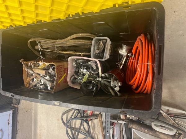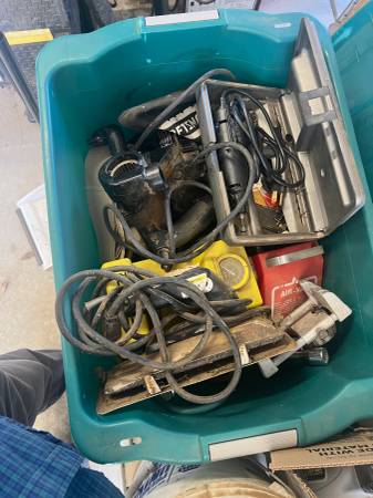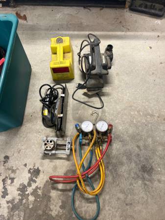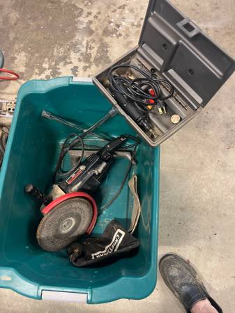 Various tools including: Body grinder belt sander, Dremel kit, carpet seam iron, portable compressor, dowel vise air conditioner gauges, Fish tape for pulling wire, conduit bender, Acetylene torch,...