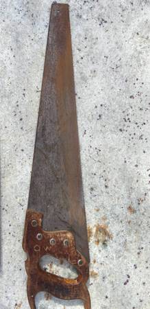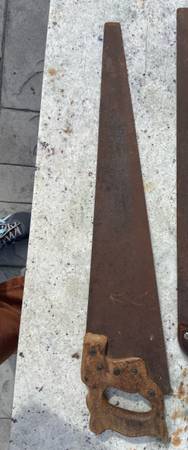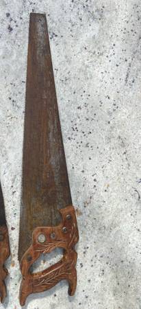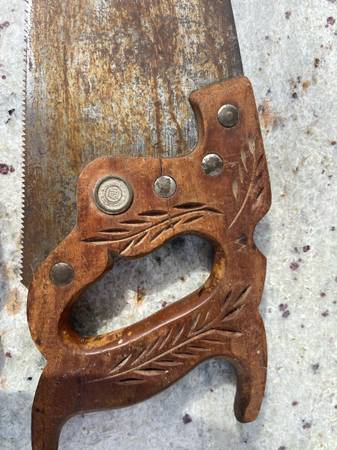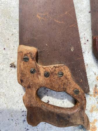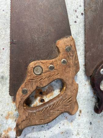 Vintage hand saws featuring unique wheat wooden handle and antique blade, with character and charm.