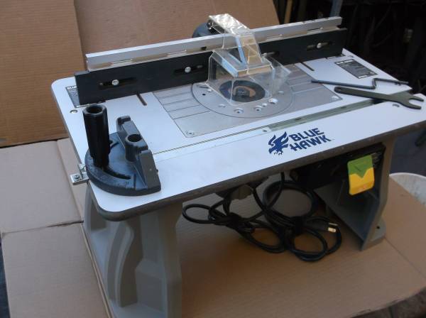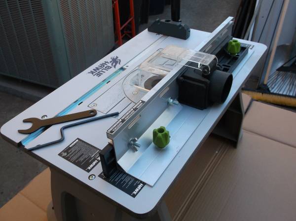 Table features 332-sq in of work surface, safety switch with dual outlets, aluminum universal mounting plate and sliding miter gauge.