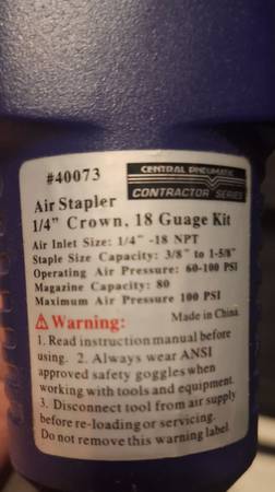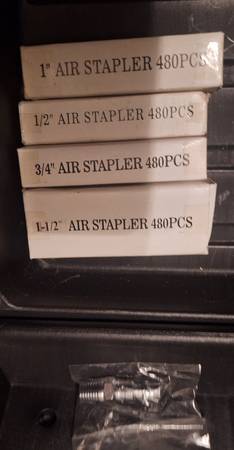 Please see photos 1/4" 18 gauge air stapler with 4 boxes of staples 1/2", 3/5", 1",1 1/2" extra air tip connector. Asking $50.00 or best offer used ones to fix a board at a rental. Original box got...