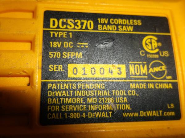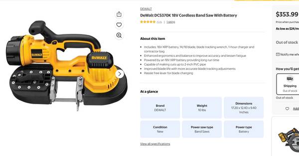 If interested Text or call me DeWalt DCS370K 18V Cordless Band Saw With Battery Includes: 18V battery, three new18 blade and charger. Capable of making cuts up to 2-inch At Walmart $353.99 plus Tax