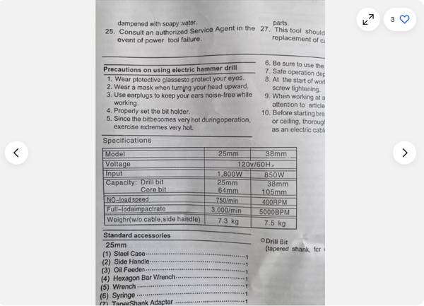 If interested Text or call me Makita Hammer Drill corded In box. Mo. 527047E 38MM 1800 watts. Various bits and accessories included with drill.