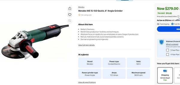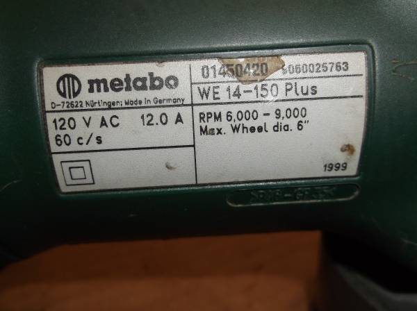 If interested Text or call me Metabo 469-WE14-150 PLUS 6 Inch Grinder 12.0 Amp Variable Speed 6000-9000 Rpm Quick Change With concrete cutting attachment and vacuum port. Made in Germany. At Walmart...
