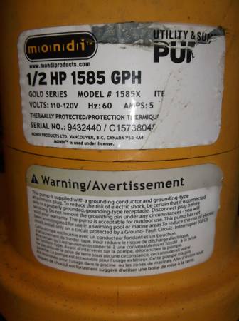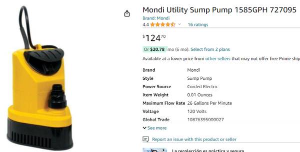 If interested Text or call me Mondi Utility Sump Pump 1585GPH. Maximum Flow Rat 26 Gallons Per Minute. At Amazon $124.70 plus Tax.