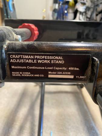The Craftsman Professional Adjustable Work Stand has height adjustments ranging from 28 to 36 inches, with stops at 30, 32, 34 and 36 inches. The frame locks in place at each of these steps; while the tabletop assembly width adjusts from 10 to 29 inches. Supports tools up to 400 pounds; a switch with duplex outlet is mounted to the front of the stand,
