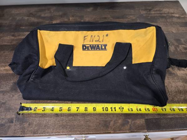 Dewalt Large Nylon Tool Bag for $5/firm. It has permanent marker writing and normal wear. Zipper works well. Measures abour 16.5"L x 12" W. It has inner and outer pockets.