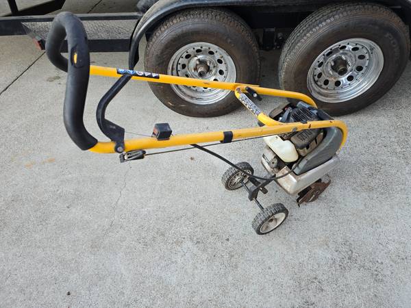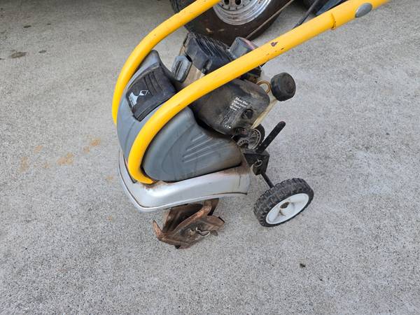 Ryobi Small Gas Rototiller Tiller/Cultivator for $5. It worked, but the fuel bulb cracked so I sprayed too much starting fluid in the carb and hydro locked it. Sold for parts.