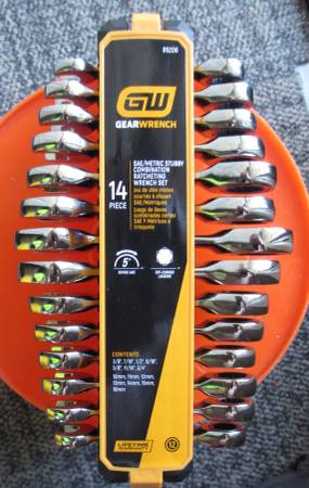 This is new and unopened in the retail package... Gearwrench 14pc Stubby Ratcheting Metric-SAE Combination Wrench Set (1) each 3/8 in 7/16 in 1/2 in 9/16 in 5/8 in 11/16 in 3/4 in and 0mm 11mm 12mm...