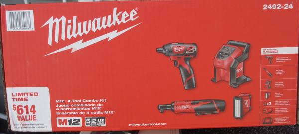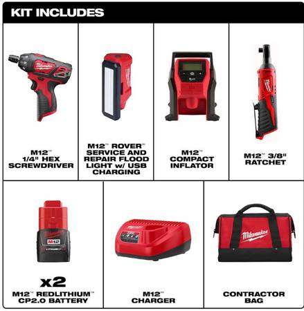 This kit is brand new and unopened, this kit has been retired by Milwaukee... Milwaukee 2492-24 M12 4-Tool Combo Kit > Inflator > Ratchet > Rover Light > Screwdriver > 2Amp Batteries...