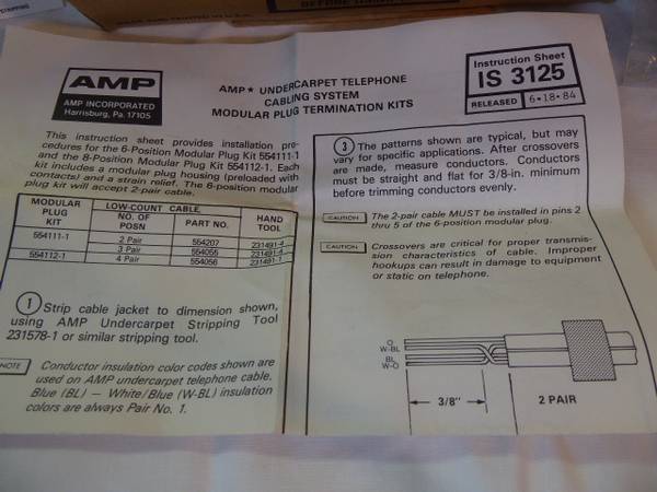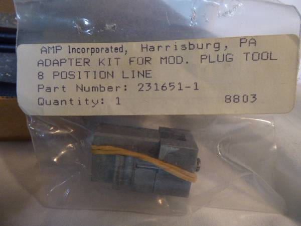 This is an AMP Cable Terminating Tool. It is AMP brand under carpet telephone cabling system modular plug termination tool. From the 1980s. 6 position adapter installed. 8 position line adapter included. In original box. Original paperwork included. All for $20. It is in Penryn. Call show contact info