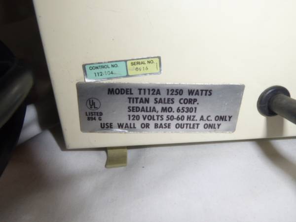 This is a Titan 1250 Watts Electric Heater with Heavy 10ft Cord. Model T112A. All metal construction. Fan and heat coils work. Temperature is adjustable with twist of the dial. Metal handle to carry. Measures 8" wide, 10 1/2" tall, 6" deep including feet. Original owner. $25. It is in Penryn. Call show contact info